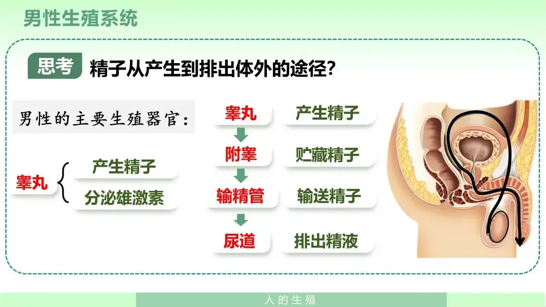 这一环节我会先出示男性生殖系统示意图,引导学生观察并说出主要器官名称。然后重点强调睾丸是男性的主要生殖器官,它的主要功能是产生精子,并分泌雄性激素。