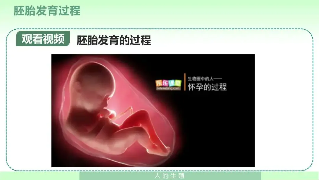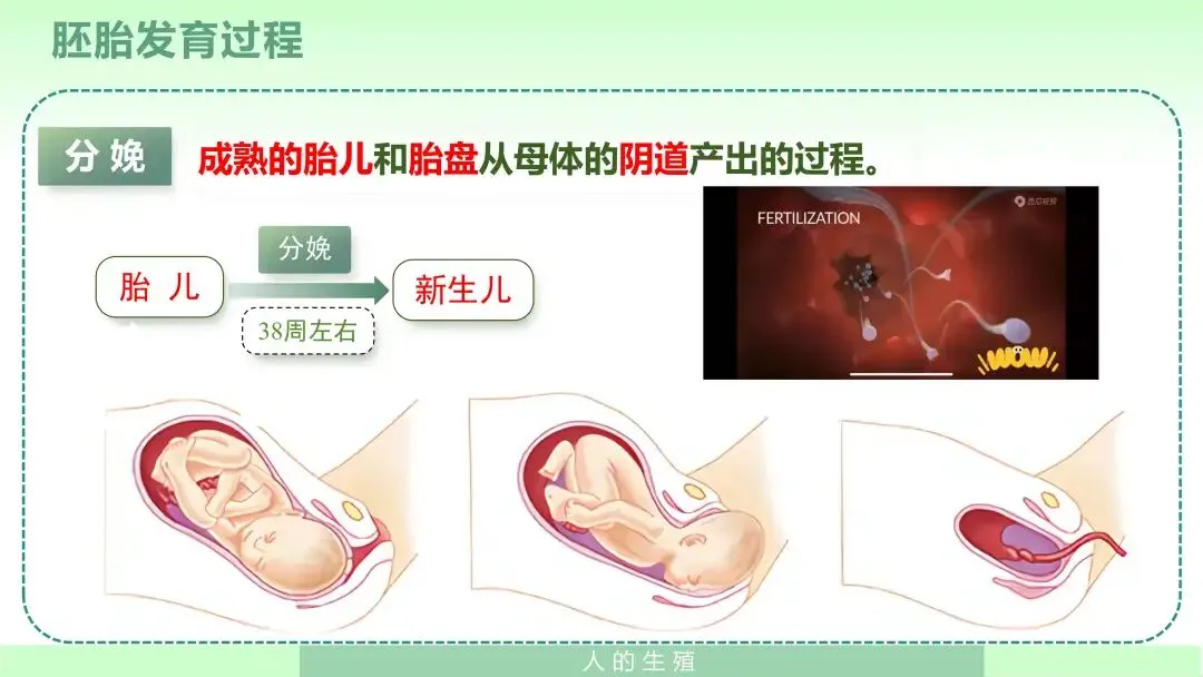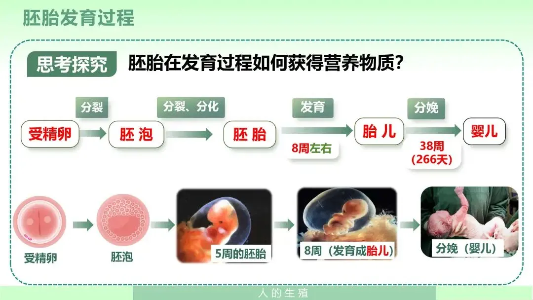 在此基础上,继续进入“胚胎发育过程”的学习。我会结合课件中的时间线,帮助学生理解受精卵经过分裂形成胚泡,进一步发育为胚胎,约8周左右发育成胎儿,经过约38周发育成熟后分娩成为婴儿。