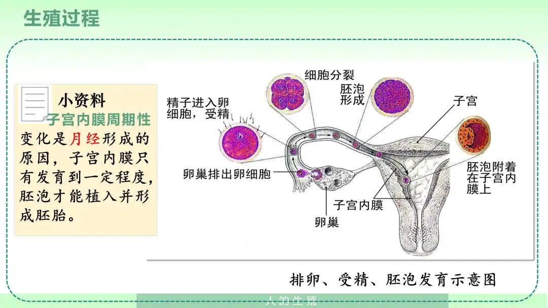 右边板书人的生殖与发育过程:精子 + 卵细胞 → 受精卵 → 胚泡 → 胚胎 → 胎儿 → 婴儿