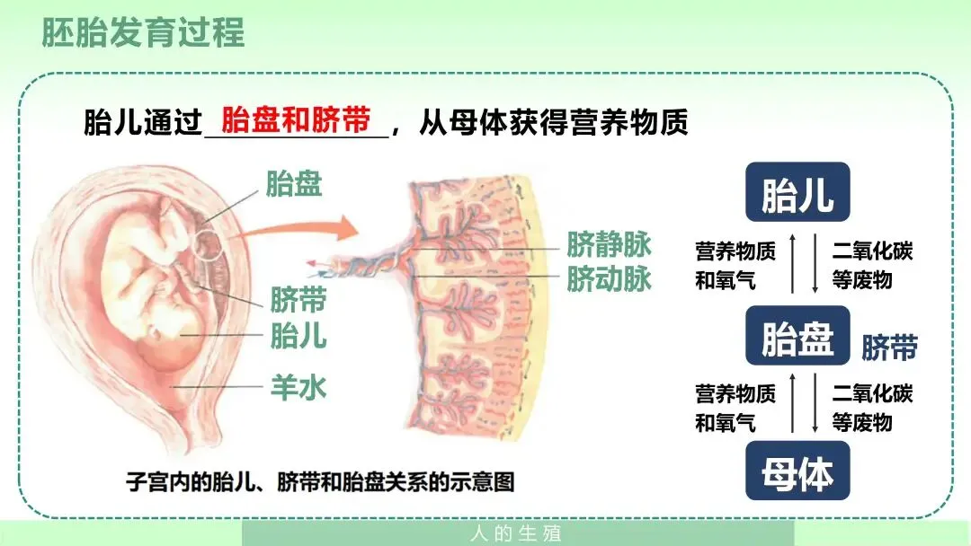 通过这一问题,引出胎盘和脐带。我会告诉学生,胎儿并不是直接从母体“吃东西”,而是通过胎盘和脐带与母体进行物质交换,从母体获得营养物质和氧气,同时把代谢废物排出。这样,学生就能将“胎儿发育”与“结构功能相统一”的生物学思想联系起来。