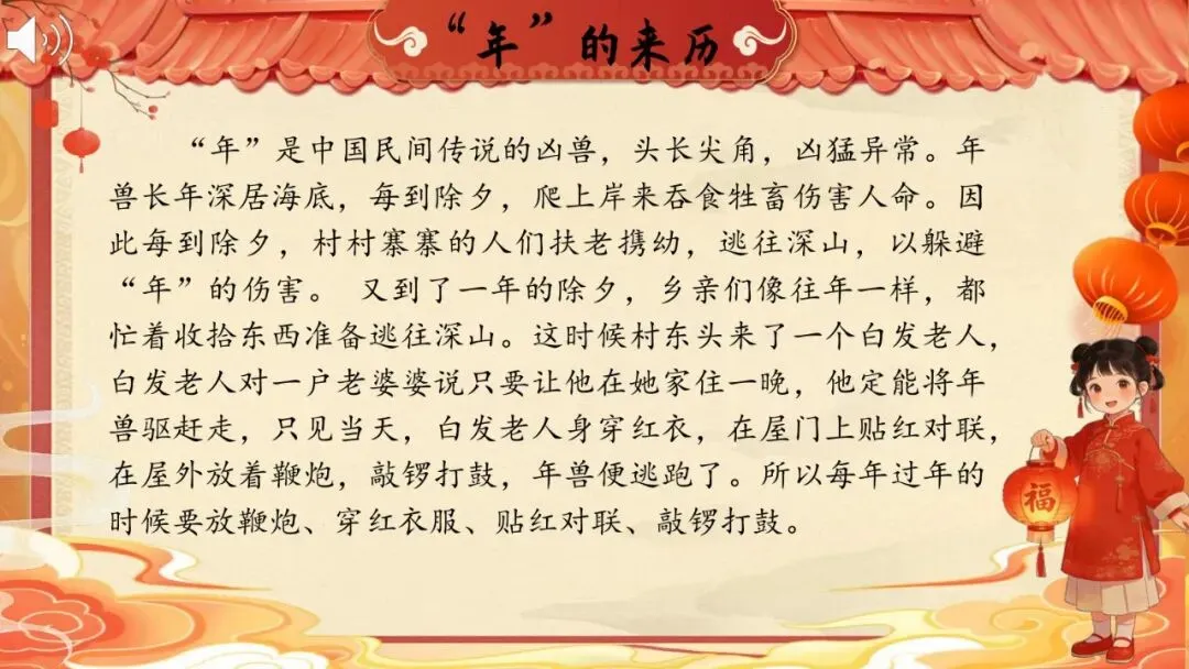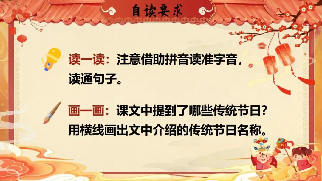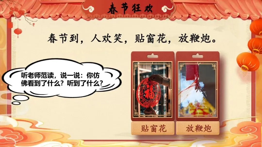 师:我们先来看看第一个节日——春节。请闭上眼睛,听老师读,边听边想象画面。