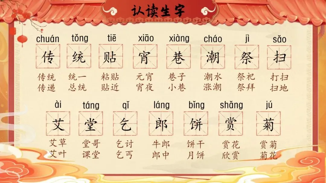 1.认识"传、统"等15个生字,会写"传、统、贴、街、扫、龙、艾、全、团、真"10个字,会写"节日、春节"等词语。