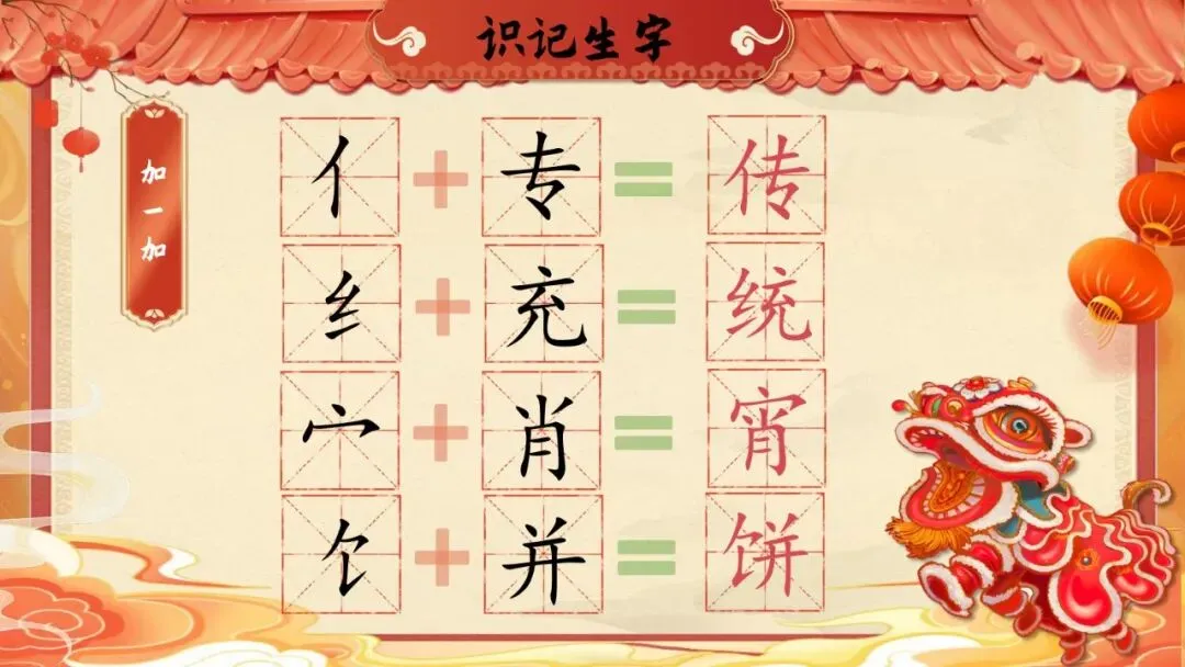 教师准备:多媒体课件(含节日图片、歌曲、花灯视频、生字卡片等)、田字格板贴、"文化印章"贴纸