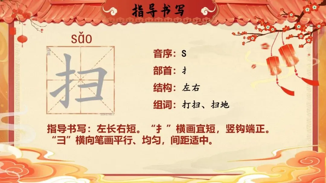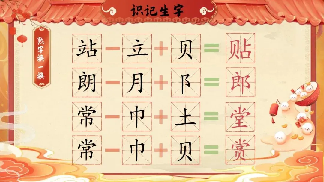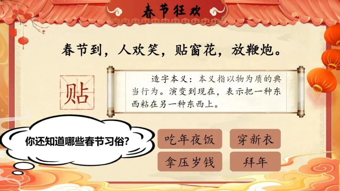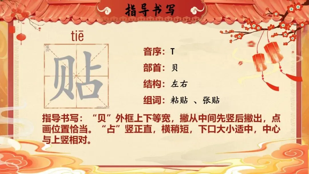 师:真棒!"贴"就是把一种东西粘在另一种东西上。贴窗花、贴对联、贴福字,都用这个"贴"。