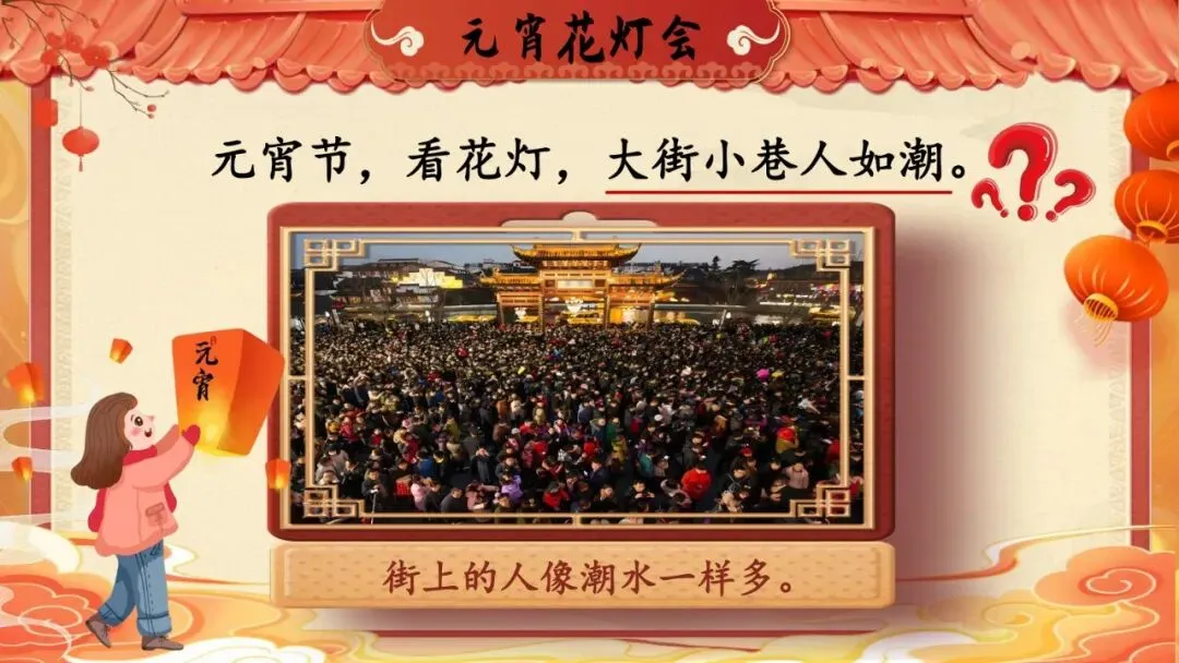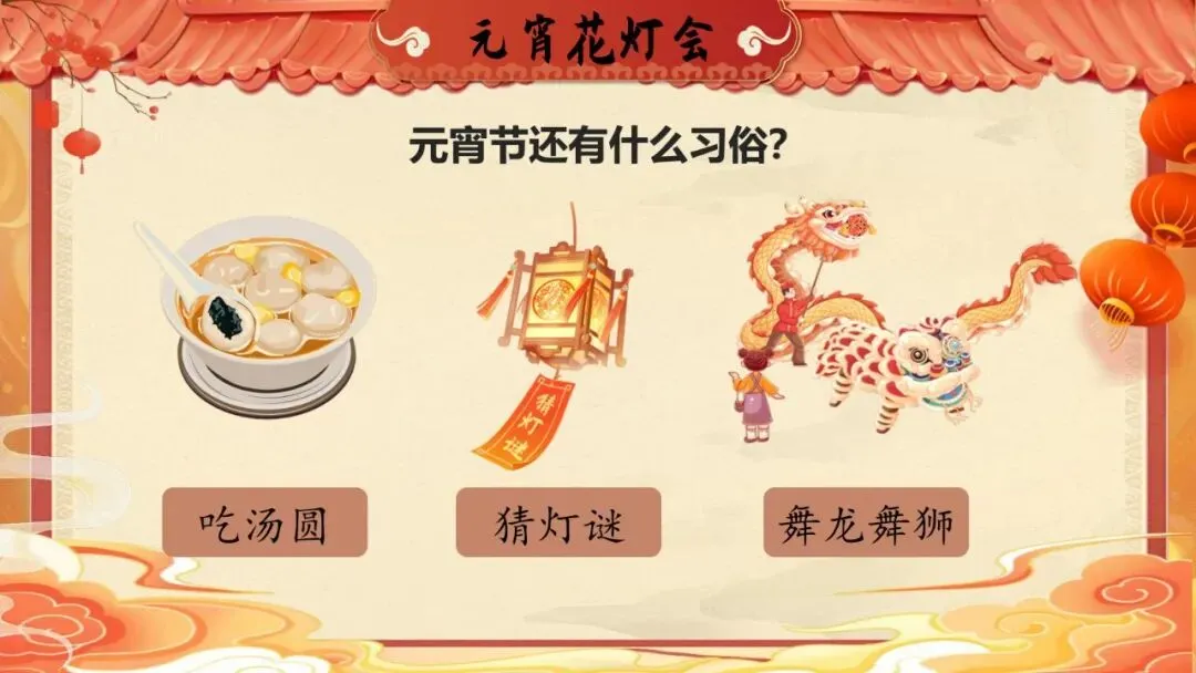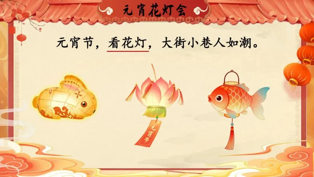 师:元宵节要看花灯,老师这里有一些灯笼,谁能把灯笼上的字读对,灯笼就会亮起来!