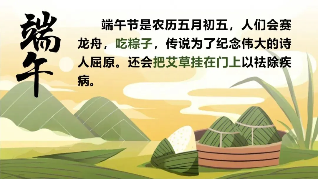 示例二(端午节):端午节那天,奶奶一大早就开始包粽子。我也学着奶奶的样子,把粽叶卷成漏斗形,放进糯米和红枣,再用绳子扎紧。虽然我包的粽子不太好看,但是吃起来特别香!妈妈还在门上挂了艾草,说可以驱虫避邪。我们还在电视上看了赛龙舟比赛,真热闹!