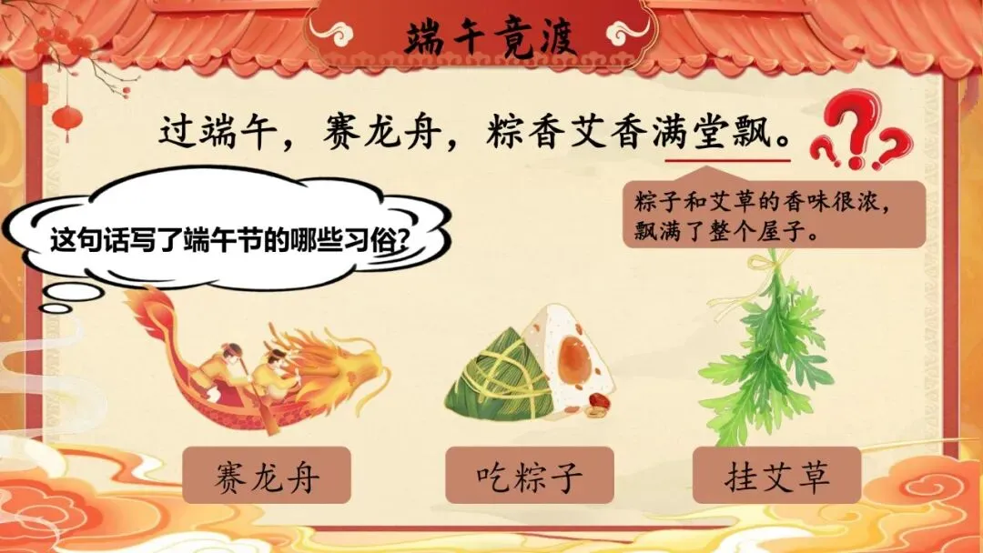 师:贴窗花、放鞭炮、吃粽子、赛龙舟……这些祖祖辈辈传下来的习俗就叫——