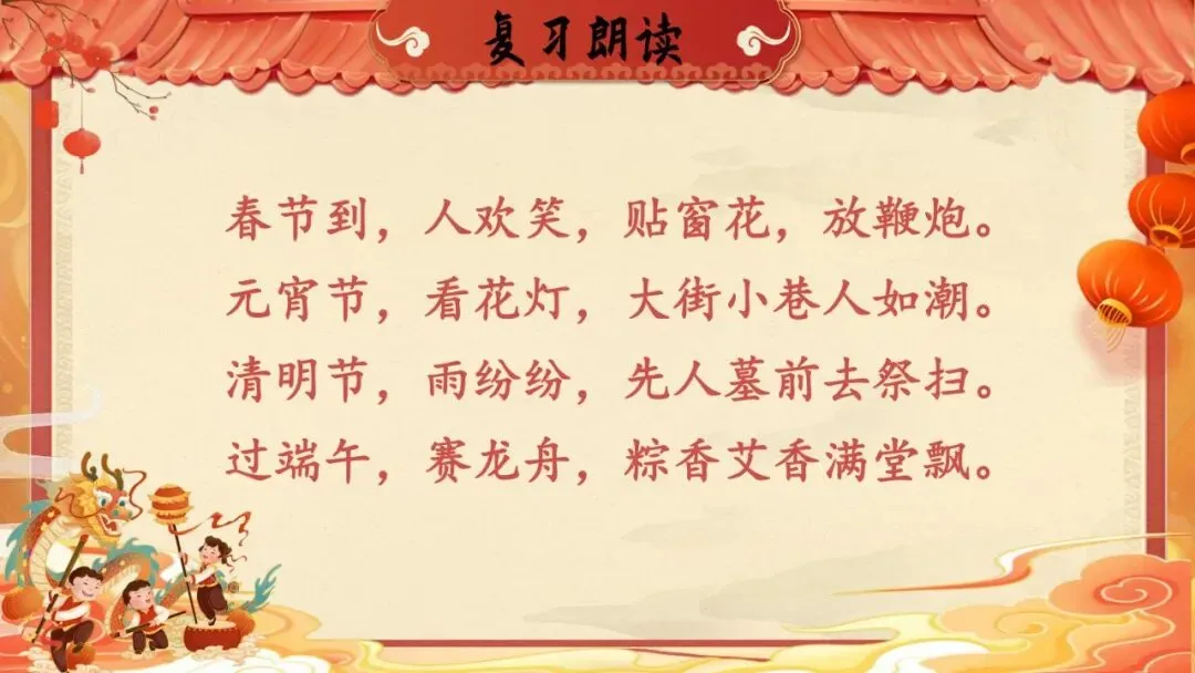 课文语言平实质朴,句式整齐,韵律和谐,读起来朗朗上口,非常适合低年级学生朗读和背诵。每个节日用简洁的语句勾勒出最具代表性的习俗画面,如"贴窗花,放鞭炮""大街小巷人如潮""粽香艾香满堂飘"等,画面感强,易于激发学生的生活经验和情感共鸣。