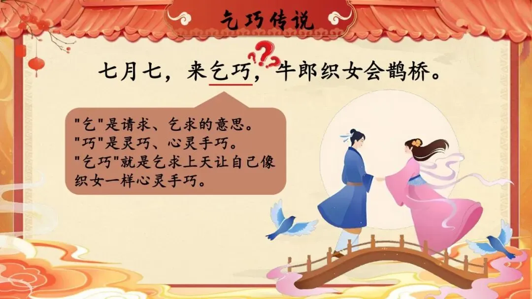 师:"乞"是请求、乞求的意思。"巧"是灵巧、心灵手巧。"乞巧"就是乞求上天让自己像织女一样心灵手巧。