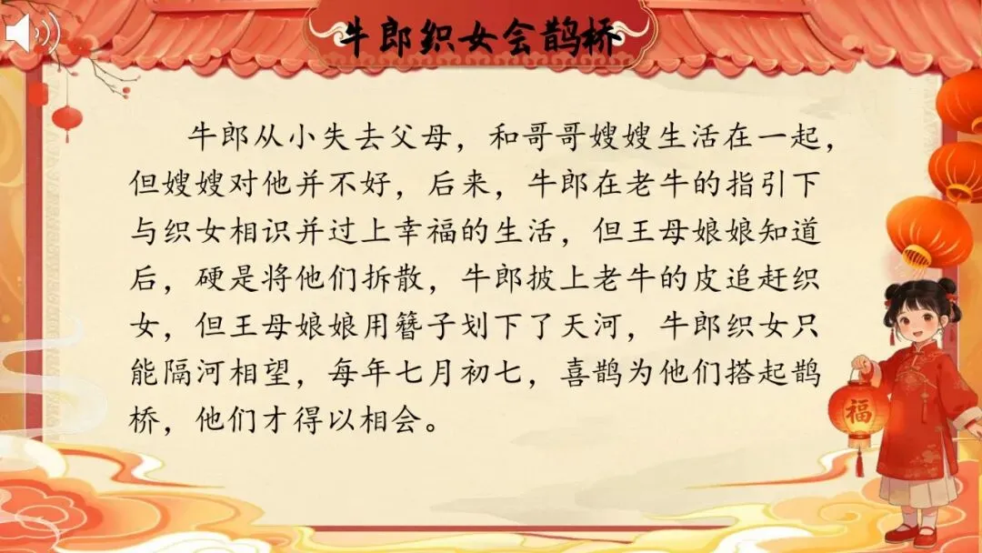 师:谁知道"牛郎织女会鹊桥"的故事?