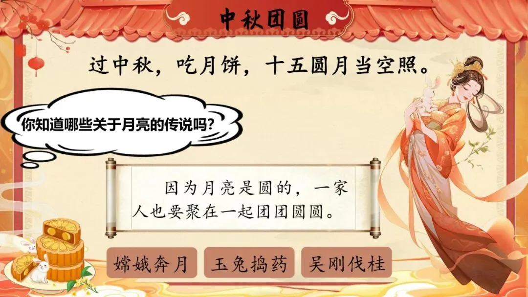 师:八月十五月正圆,中秋月饼香又甜。关于月亮,有什么美丽的传说?