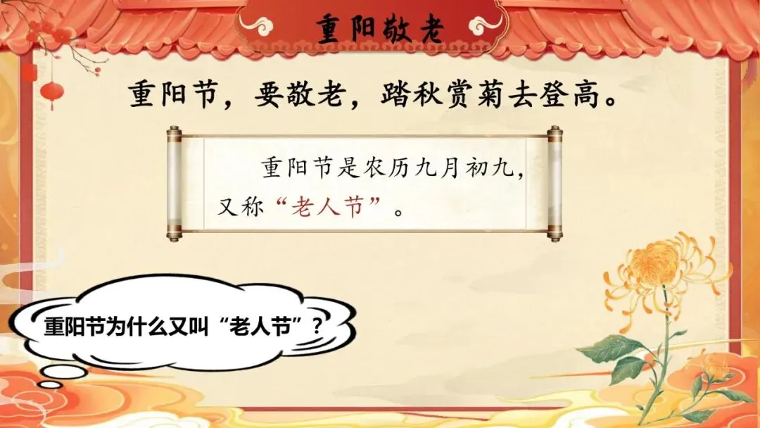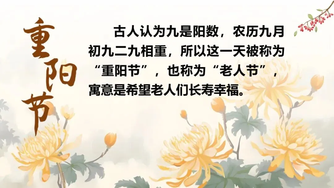 师:古人认为九是阳数,农历九月初九二九相重,所以这一天被称为“重阳节”,也称为“老人节”,寓意是希望老人们长寿幸福。
