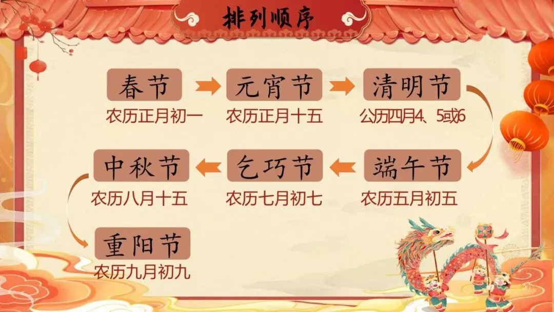 •按节日顺序记忆:春节→元宵节→清明节→端午节→乞巧节→中秋节→重阳节