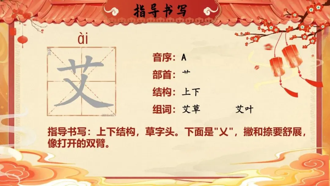 艾:上下结构,草字头。下面是"乂",撇和捺要舒展,像打开的双臂。
