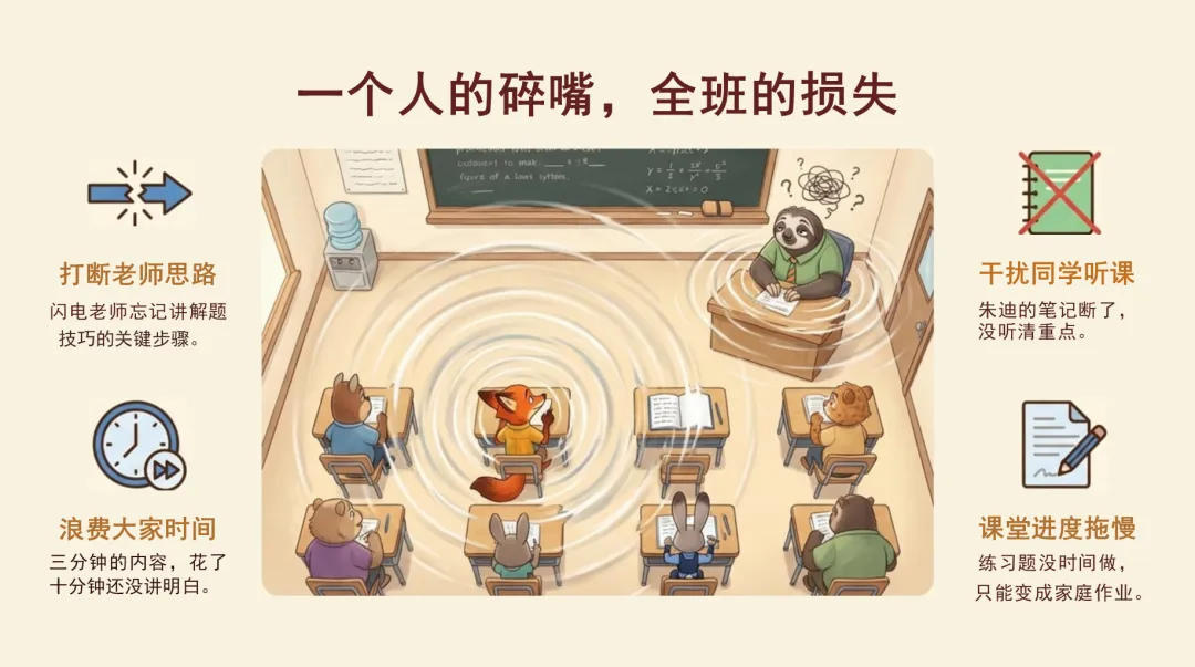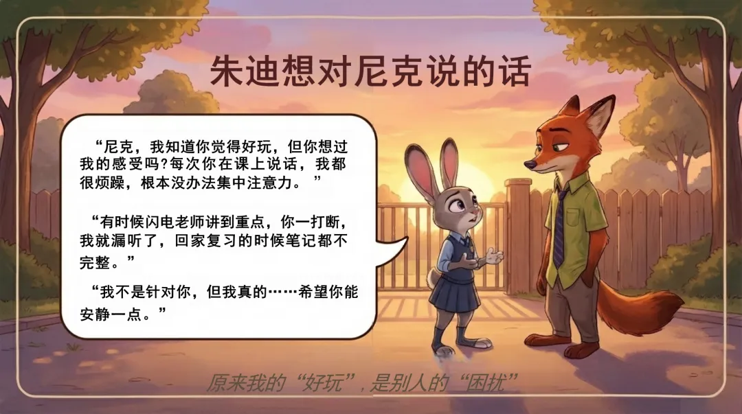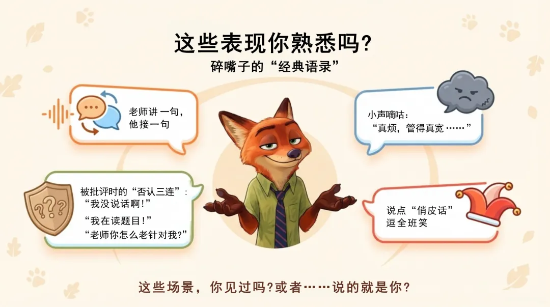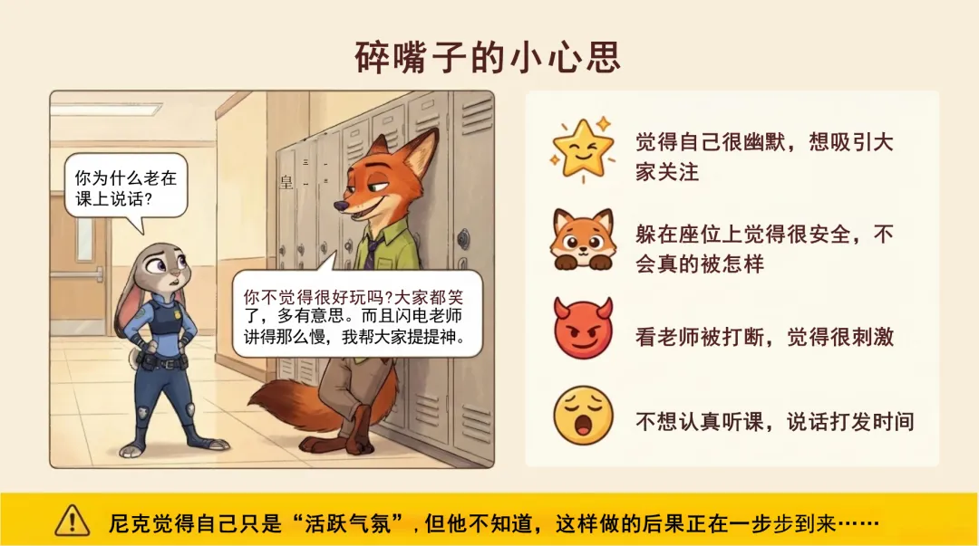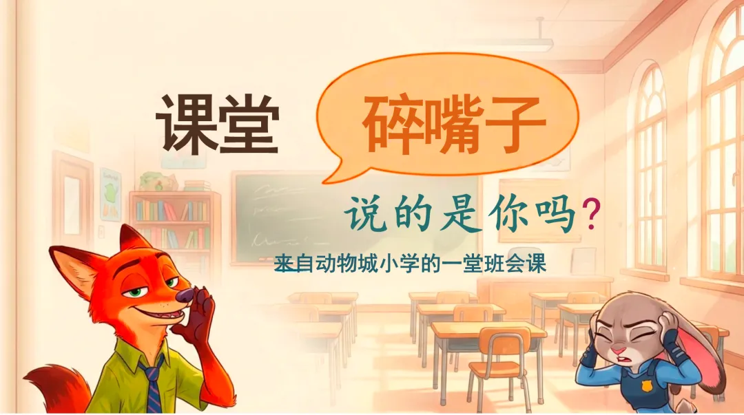 同学们好!今天我们要上一堂特别的班会课,故事发生在动物城小学五年级(1)班。这个班最近有个让所有老师头疼的问题——班里有个“碎嘴子”。他是谁呢?就是我们熟悉的狐狸尼克。今天,我们就跟着尼克的故事,一起来聊聊课堂上的“碎嘴子”问题。说的是你吗?让我们一起来看看。