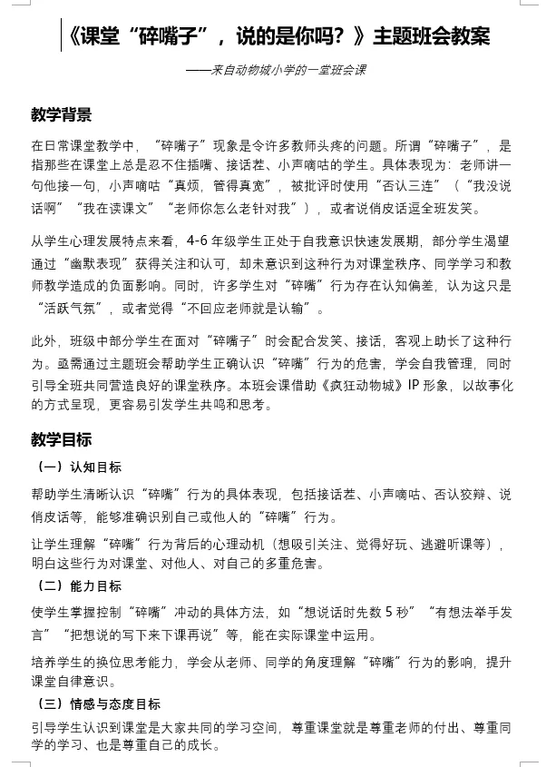 帮助学生准确识别“碎嘴”行为的各种表现形式,建立对“碎嘴”行为的正确认知,理解其对课堂秩序、教学效果和人际关系的负面影响。