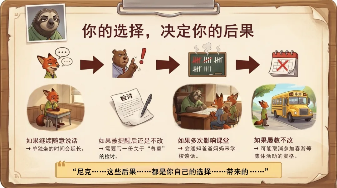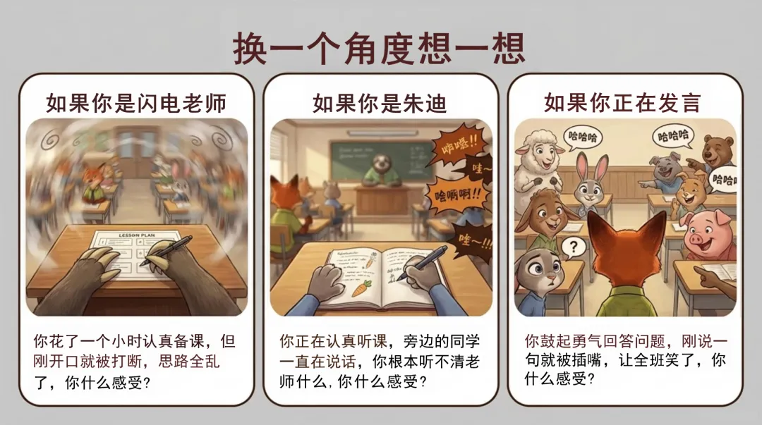 引导全班学生形成共识:不回应、不配合笑的同学不是“不合群”,而是在帮助全班维护课堂秩序,切断“碎嘴子”的观众,让其自觉无趣。