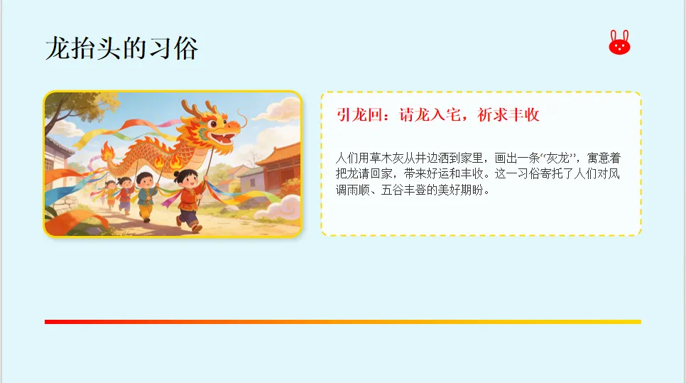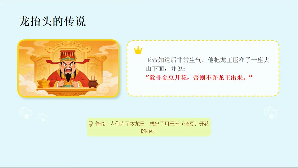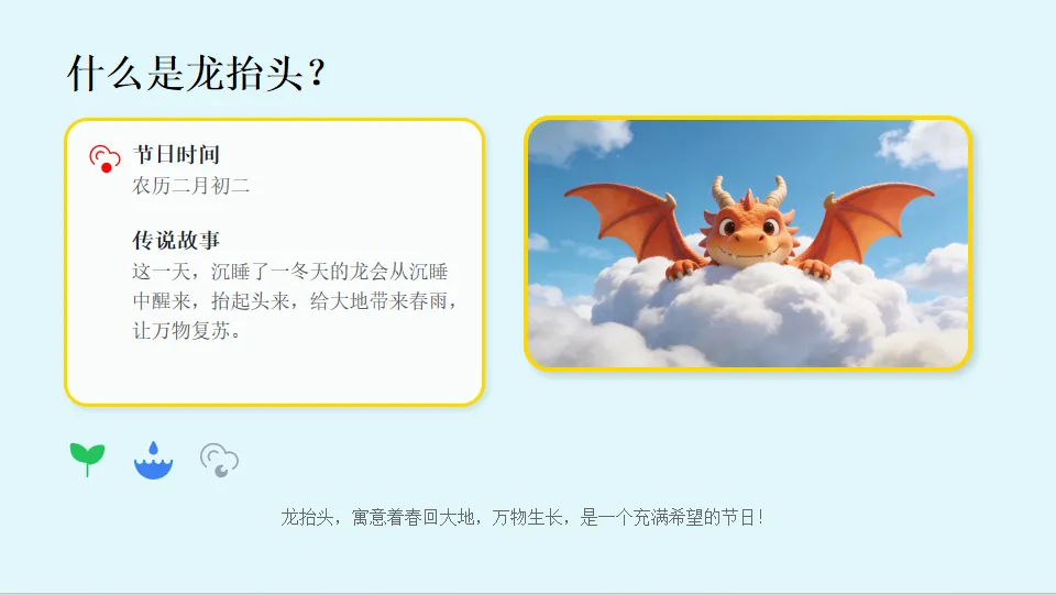 1.播放 PPT 第 3 页,教师讲解:“农历二月初二是龙抬头的日子,传说这一天,龙会从沉睡中醒来,抬起头来,给大地带来春雨。”