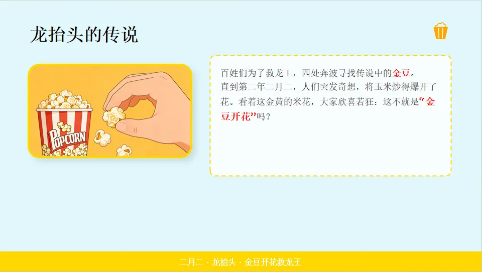1.依次播放 PPT 第 4-7 页,教师生动地讲述 “金豆开花救龙王” 的传说。
