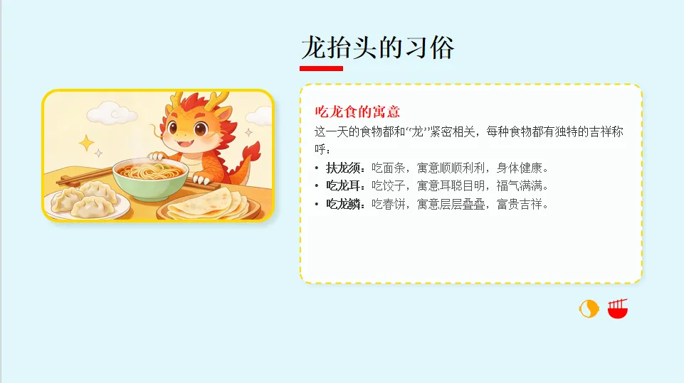 2.技能目标:了解龙抬头的传统习俗,如剃龙头、吃龙食等,能参与简单的模仿和游戏活动。