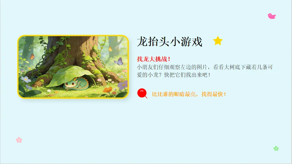 2.找龙:播放 PPT 第 12 页,引导幼儿在图片中寻找隐藏的小龙。