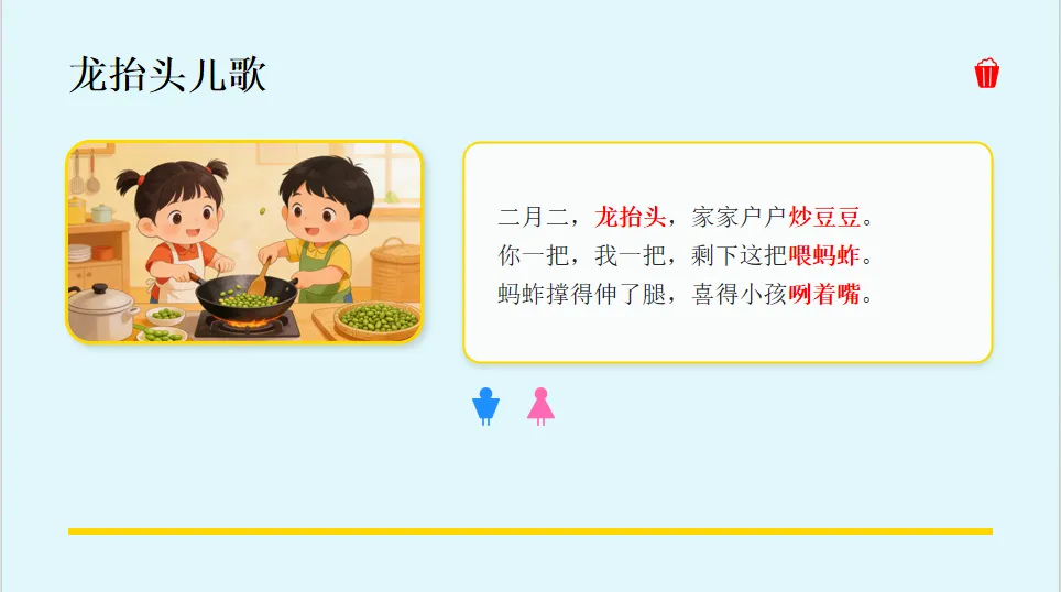 1.播放 PPT 第 13、14 页,教师带领幼儿学习两首关于龙抬头的儿歌,鼓励幼儿边念边做动作。