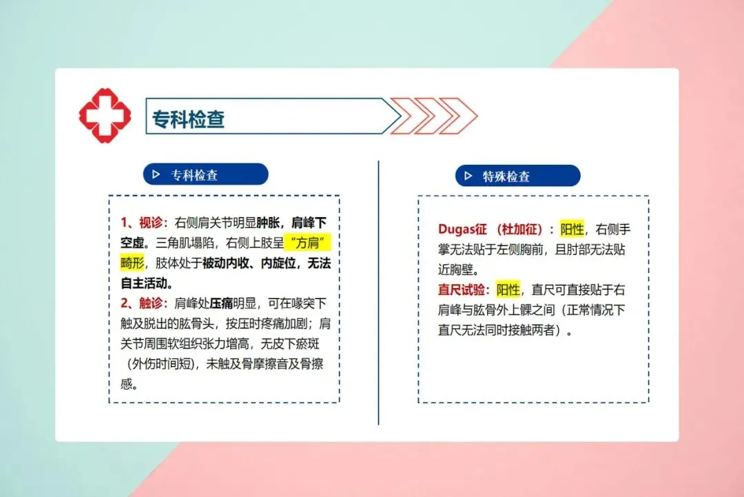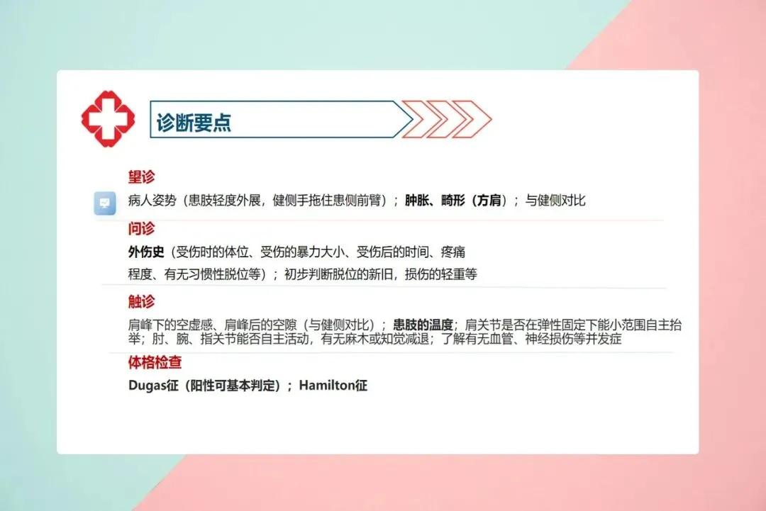 脱位后有哪些表现?最典型的是“方肩畸形”——原本圆润的肩膀变成方的,因为肱骨头跑到了别的地方。患者会感到剧痛,手臂像被“锁”住一样,既抬不起来也转不动,只能被迫保持轻度外展的姿势,另一只手托着伤侧。还有一个简单的自测方法:患侧手摸不到对侧肩膀,或者摸到了但肘关节贴不到胸壁,这叫搭肩试验阳性,基本可以判断是脱位了。