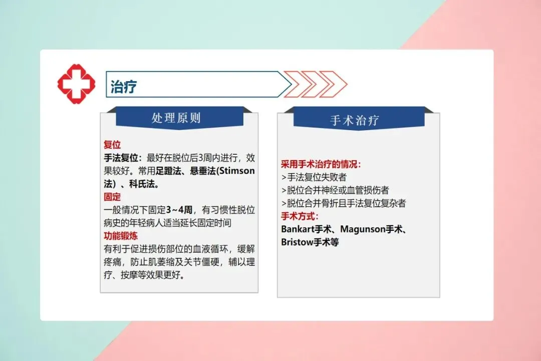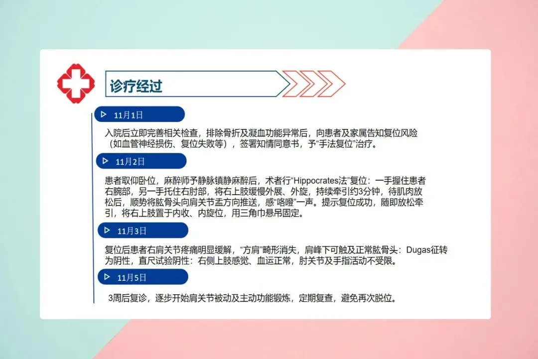 在急诊,医生通常会先拍X光片,排除骨折,然后评估有无血管神经损伤。如果没有禁忌,就会进行手法复位。常用的方法叫Hippocrates法,患者平躺,医生在镇静麻醉下持续牵引上肢,放松肌肉,然后把肱骨头“送”回关节盂。复位成功时会听到“咯噔”一声,疼痛立刻缓解,方肩消失,手臂又能摸到对侧肩膀了。