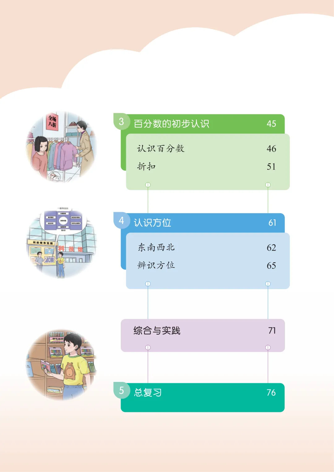 百分数的初步认识:以生活中的百分数场景为切入点,讲解百分数的含义、读写,重点关联“折扣” 应用,培养学生的购物决策能力。
