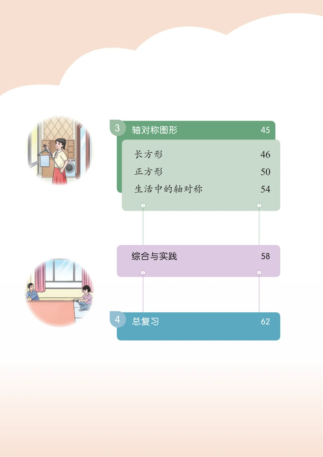 第三单元轴对称图形 | 认识长方形、正方形;轴对称图形特征;生活中的轴对称现象 | 掌握长方形、正方形的特征;识别生活中的轴对称图形 | 理解“对折后完全重合” 的含义;区分长方形与正方形 |