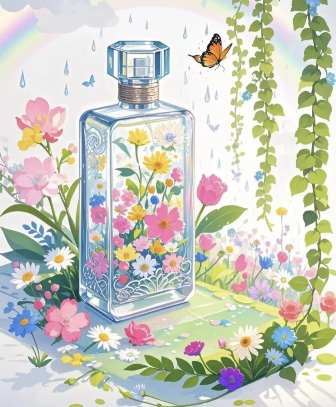 ◦ 用浅灰色水彩晕染瓶身背景,营造透明感。