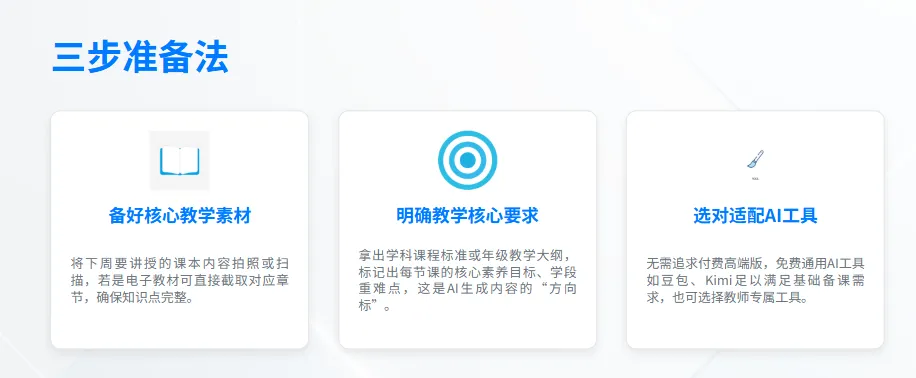 AI 备课的核心原则是 “你给的信息越具体,它生成的内容越贴合教学实际”,无需繁琐的材料整理,只需做好三件事,3 分钟就能完成准备: