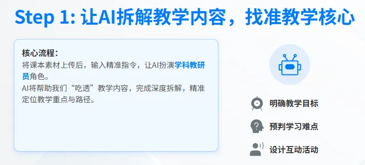 通用指令模板:“这是我要教的 [年级 + 学科 + 内容名称],请你扮演该学科一线教研员,帮我完成以下分析: