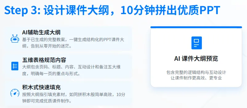 教案确定后,课件制作无需再抠排版和内容结构,让 AI 生成标准化的课件大纲,我们只需按照大纲填充素材,就能快速做出逻辑清晰、重点突出的 PPT。