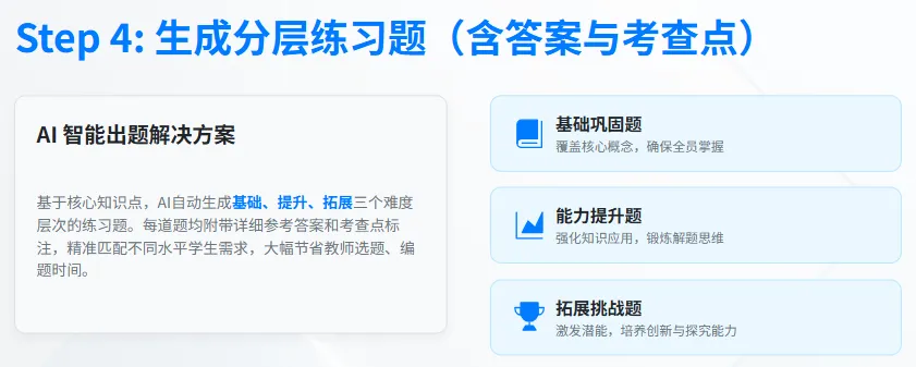 课后练习是巩固课堂知识的关键,让 AI 生成基础、提升、拓展三层练习题,适配不同水平的学生,且标注考查点和参考答案,省去我们找题、编题、核对答案的时间。