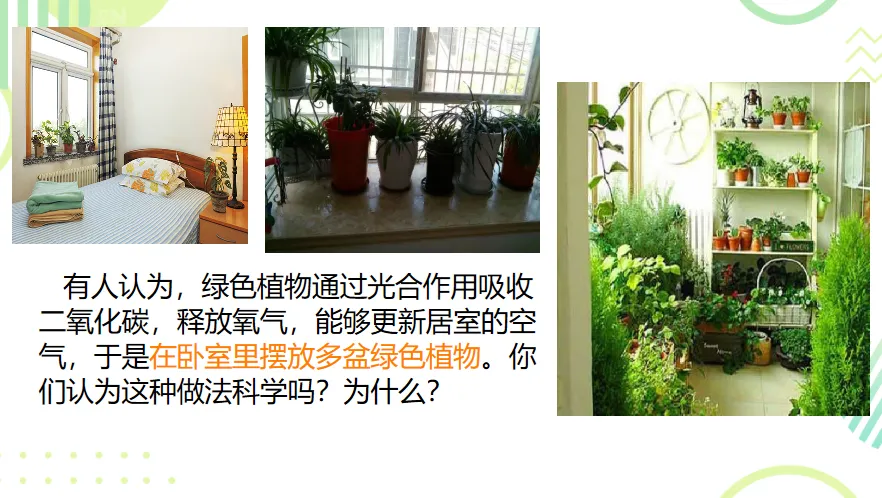 师: 那么回到这节课老师问大家的问题,卧室里适合放置很多绿色植株吗?(这是一个容易混淆的点)