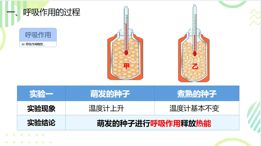 师(总结板书): 非常好!这说明活的种子在进行呼吸作用时,会释放出能量(热量)。