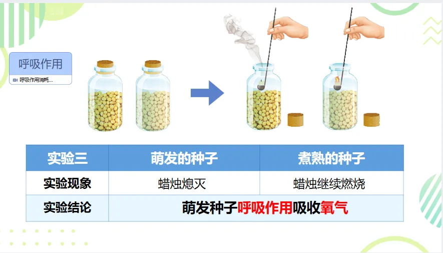 生: 因为瓶子里没有氧气了,被种子用掉了。