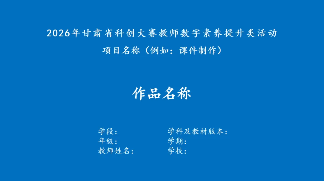 (1)制作要求:视频、声音、动画等素材需使用常用文件格式;课件应易于安装、运行和卸载。课件首页、视频片头须采用“片头模板”(见附件7),蓝底白字、楷体,显示教材版本、学段学科、年级学期、课名、教师姓名和所在单位等信息,视频片头时长5秒。