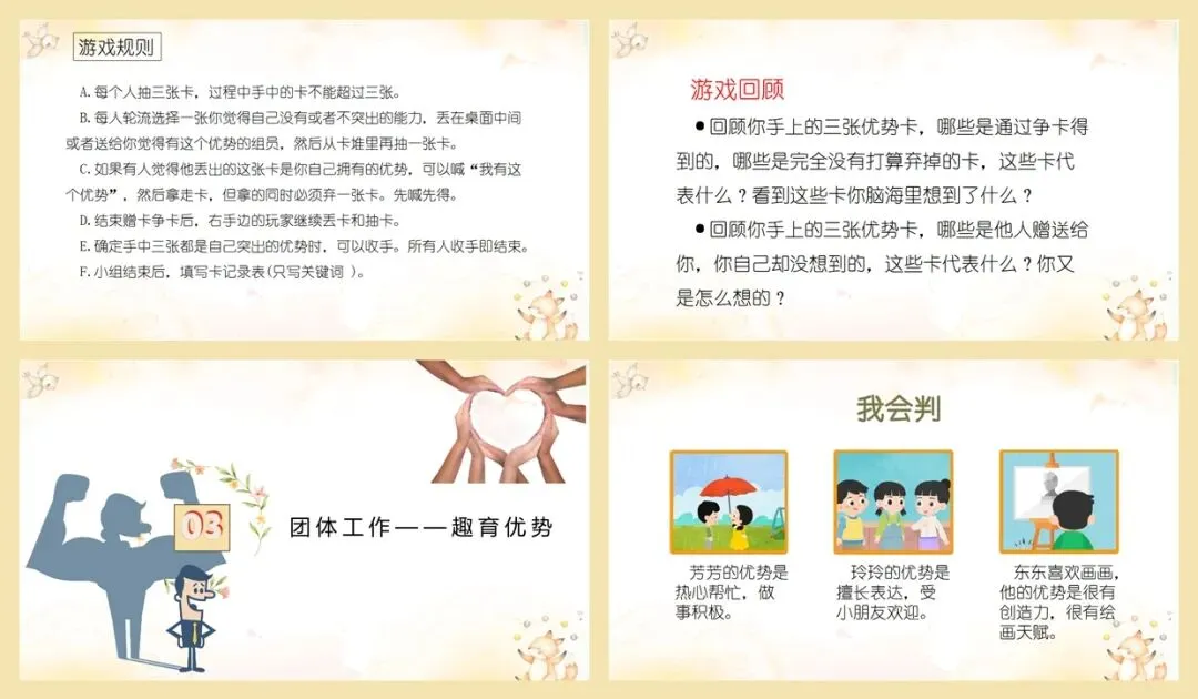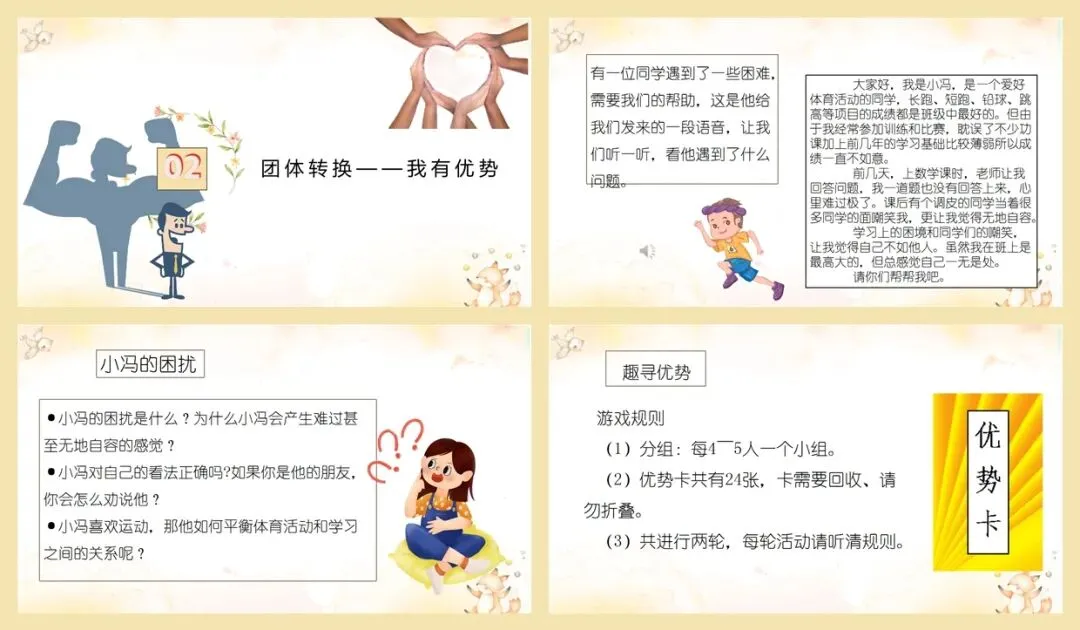 如何寻找自己的优势呢?我们先玩个“趣寻优势”的游戏。教师展示优势卡,
