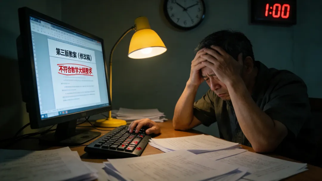 键盘的敲击声在凌晨1点停了,老李盯着电脑屏幕上被打回的第三版教案,重重地叹了口气。