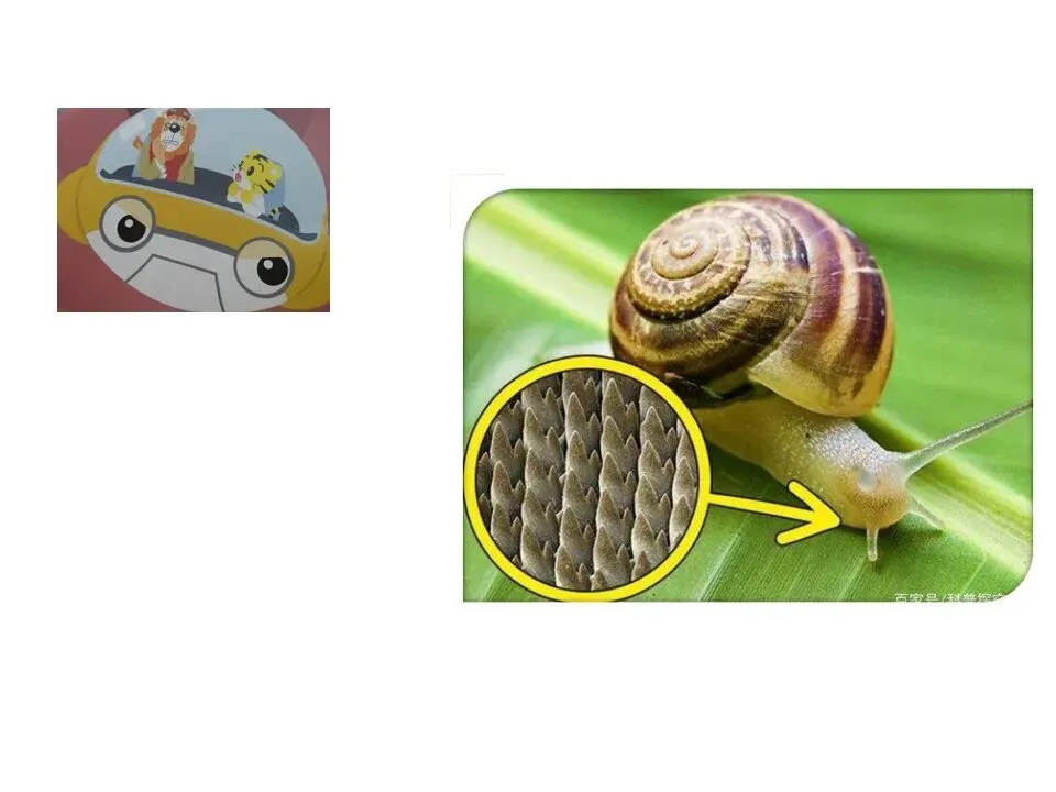 师:蜗牛除了用腹足爬行以外,它还有一个神奇的地方呢,它是世界上牙齿最多的动物,它的嘴巴里有成千上万颗牙齿嫩,你们想不想乘上巧虎的“BB号”一起去看一看呢。好,我们缩小、再缩小,进入蜗牛嘴巴去看一看吧。