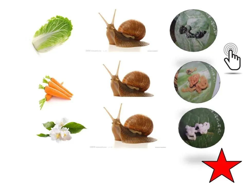 设计理念:《3—6岁儿童发展指南》科学领域教育建议中指出:“经常带幼儿接触大自然,激发其好奇心与探究欲望。”雨天的幼儿园里草丛边、菜地旁幼儿经常能找到小蜗牛的身影,他们对小蜗牛的特殊爬行方式很感兴趣,想要一探究竟,因此想通过这一科学活动与幼儿共同了解蜗牛的外形特征,了解蜗牛是由哪些部分组成的。结合《指南》设计了“给蜗牛喂食”的小游戏,能让幼儿“对事物或现象进行观察比较,发现其相同与不同。”通过“给蜗牛喂食”的小游戏,幼儿能直观地观察到蜗牛便便的颜色变化,发现蜗牛吃不同颜色的食物会拉出不同颜色的便便。这些都是基于幼儿的兴趣点,让幼儿能对周围的事物产生兴趣后进行探究进一步认识事物,使他们的好奇心在探索过程中得到满足。