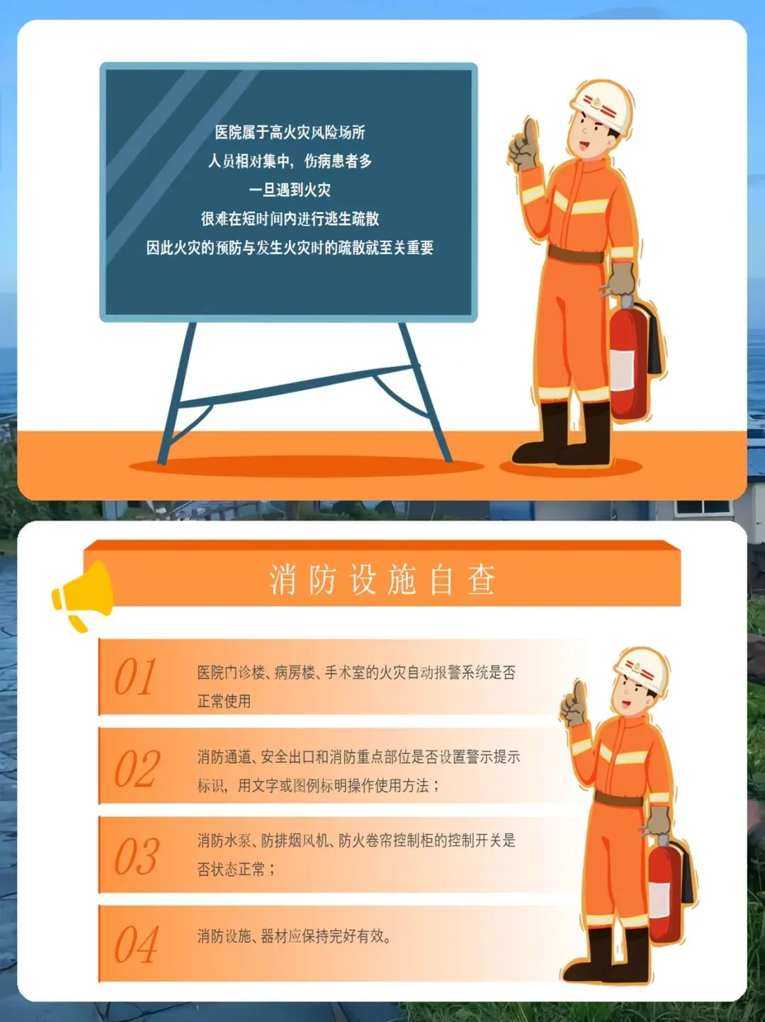 首先是消防设施自查。我们要检查门诊楼、病房楼、手术室的火灾自动报警系统是否能正常使用;检查消防通道、安全出口以及重点部位是否设置了清晰的警示提示标识。同时,我们要确认疏散通道是否被杂物堵塞,防火门是否保持正常状态——经常有人通行的地方应设为常开式,而楼梯间、管道井等部位的防火门则必须保持常闭。