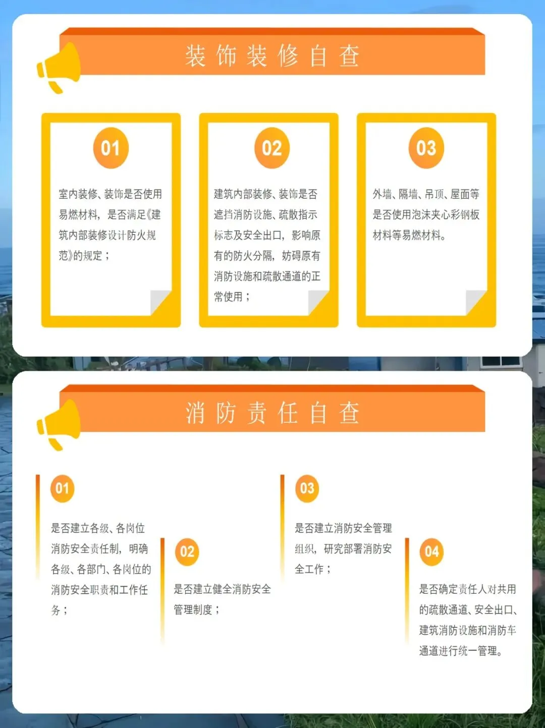 最后是装饰装修自查。我们要确保室内装修没有使用易燃材料,没有遮挡消防设施和疏散指示标志,更严禁在建筑内部使用泡沫夹心彩钢板等易燃材料。