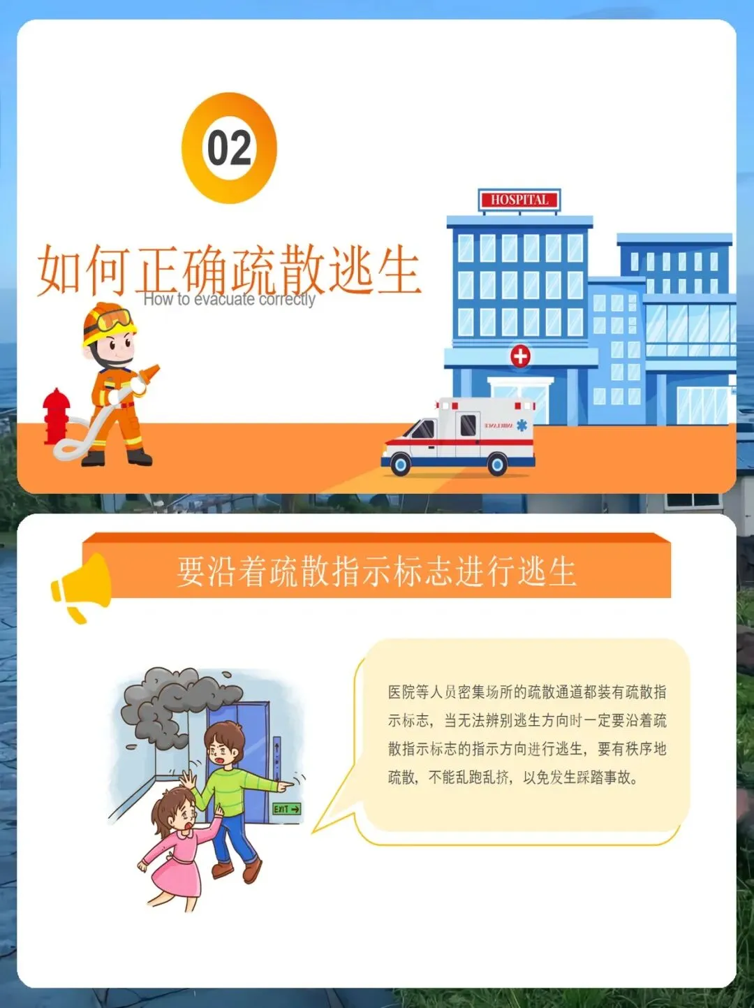 如果不幸遭遇火灾,我们该如何自救?请记住,医院的疏散通道都装有疏散指示标志。当无法辨别方向时,一定要沿着这些标志的指示方向有序疏散,切忌乱跑乱挤,防止发生踩踏。