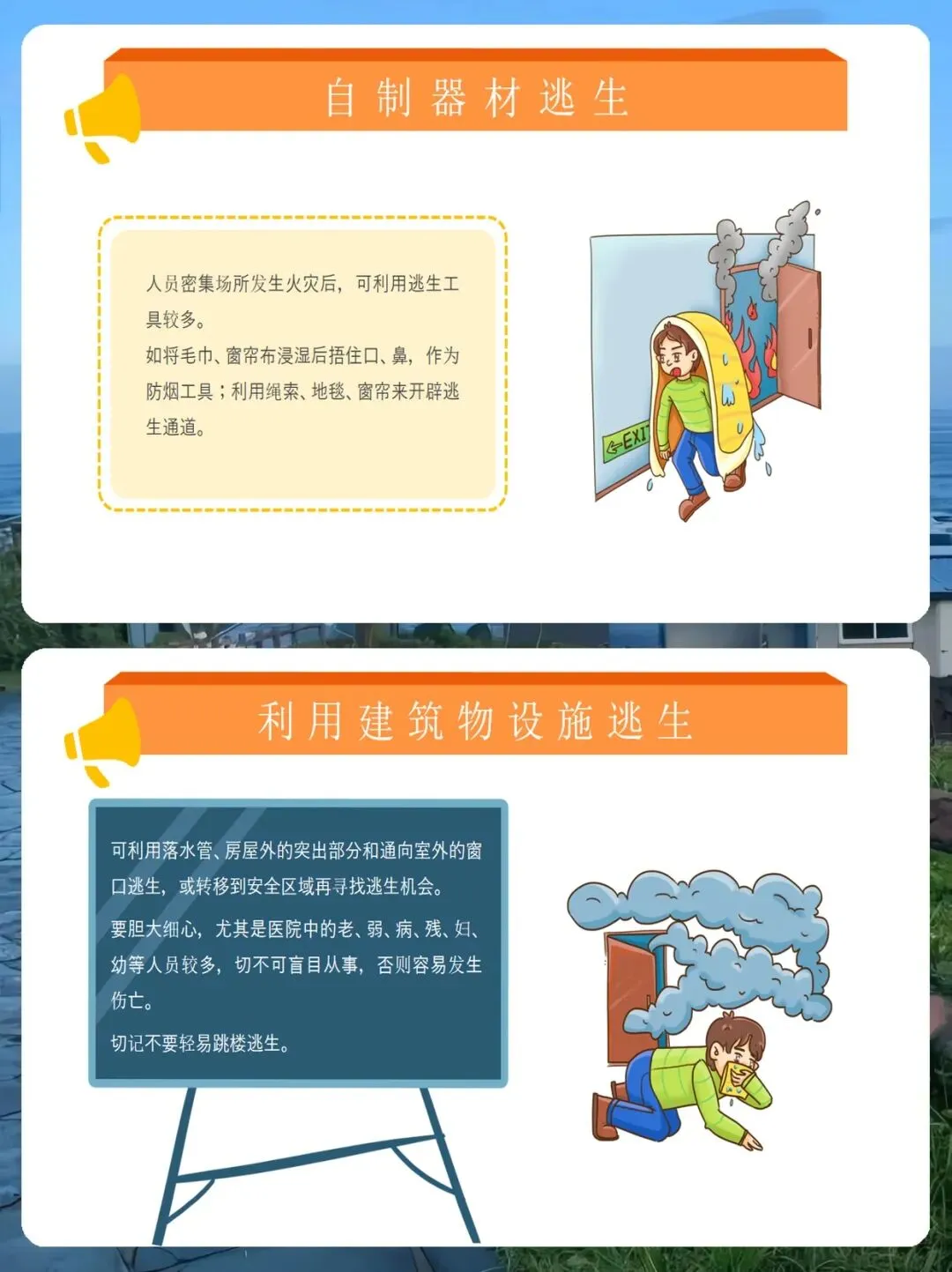在逃生过程中,我们可以利用身边的物品。比如将毛巾、窗帘布浸湿后捂住口鼻作为防烟工具;利用绳索、地毯、窗帘开辟通道;或者利用落水管、房屋外的突出部分逃生。但对于老、弱、病、残、妇、幼等人员,切不可盲目跳楼。