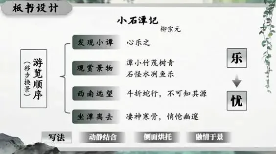 2.情感过渡可更自然: "乐"到"忧"的情感转折是教学难点,部分学生对"潭西南而望"作为情感转折点的理解不够深入。可尝试增加"望"与"见"的词义辨析环节,让学生体会主动远眺与无意发现的心理差异。