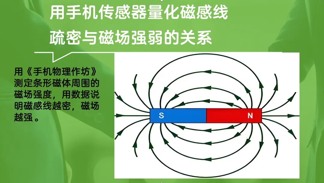 演示准备:下载手机物理作坊、EN等App,条形磁体一个,磁感线疏密程度平面图一张。