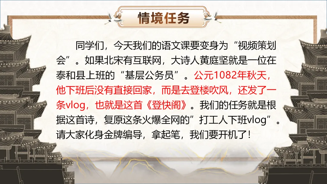 >【高二教学课件48‖AI赋能公开课】《登快阁》:打工人下班vlog——今日主人公:黄庭坚 (含视频)